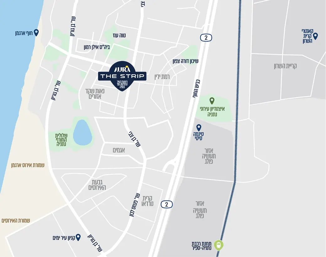ממוקם בסמוך למוקדי המסחר והתעסוקה של העיר, הנמצאים ממזרח לכביש 2: אזור התעשייה פולג, איקאה, קרית הממשלה, ובקרבה לציר תחבורה "מהיר לעיר" כך שהגישה תהיה מהירה ונוחה. כמו כן, הקרבה לקניון עיר ימים, לפארק השלולית, פארק המסילה, פארק לב המטרופולין, ולרצועת החוף המדהימה של נתניה במרחק דקות הליכה ספורות, הולכים לאפשר חיי קהילה תוססים לדיירי AURA THE STRIP.